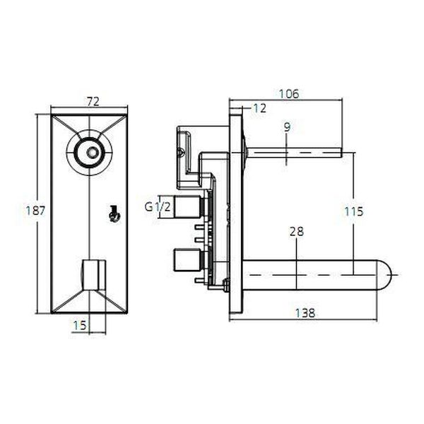 Ideal Standard Simply U A4481AA Смеситель для раковины: настенный, прямоугольный излив 136 мм, с прямоугольной накладкой, полный комплект (внешняя и внутристенная части), картридж 40 мм IS Multiport JOYSTICK, литой прямоугольный излив, проекция 126 мм, антивандальный ламинарный аэратор M24X1-A, металлическая рукоятка с индикаторами горячей/холодной воды. Внутренний механизм A4491NU в комплекте.