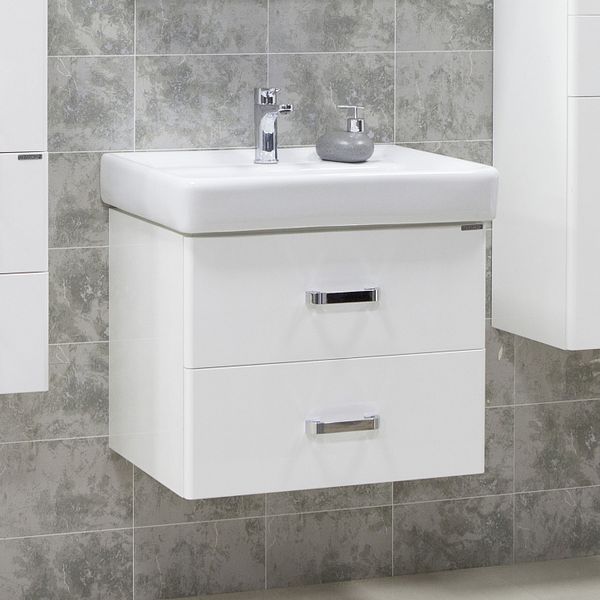 Тумба изготовлена из декоративной влагостойкой ДСП, фасады выполнены из МДФ, покрытой белой эмалью. Изделие имеет два ящика: высокий вместительный нижний предназначен для крупных предметов, а в верхнем пространство разграничено разделителями для хранения мелких вещей. Усовершенствованные направляющие, рассчитанные на нагрузку 25 кг, обеспечивают их надежное крепление, а встроенные доводчики гарантируют плавное и бесшумное закрывание.Конструкция тумбы позволяет вывести все коммуникации не только в стену, но и снизу – в пол. Благодаря этому установить тумбу стало гораздо проще!